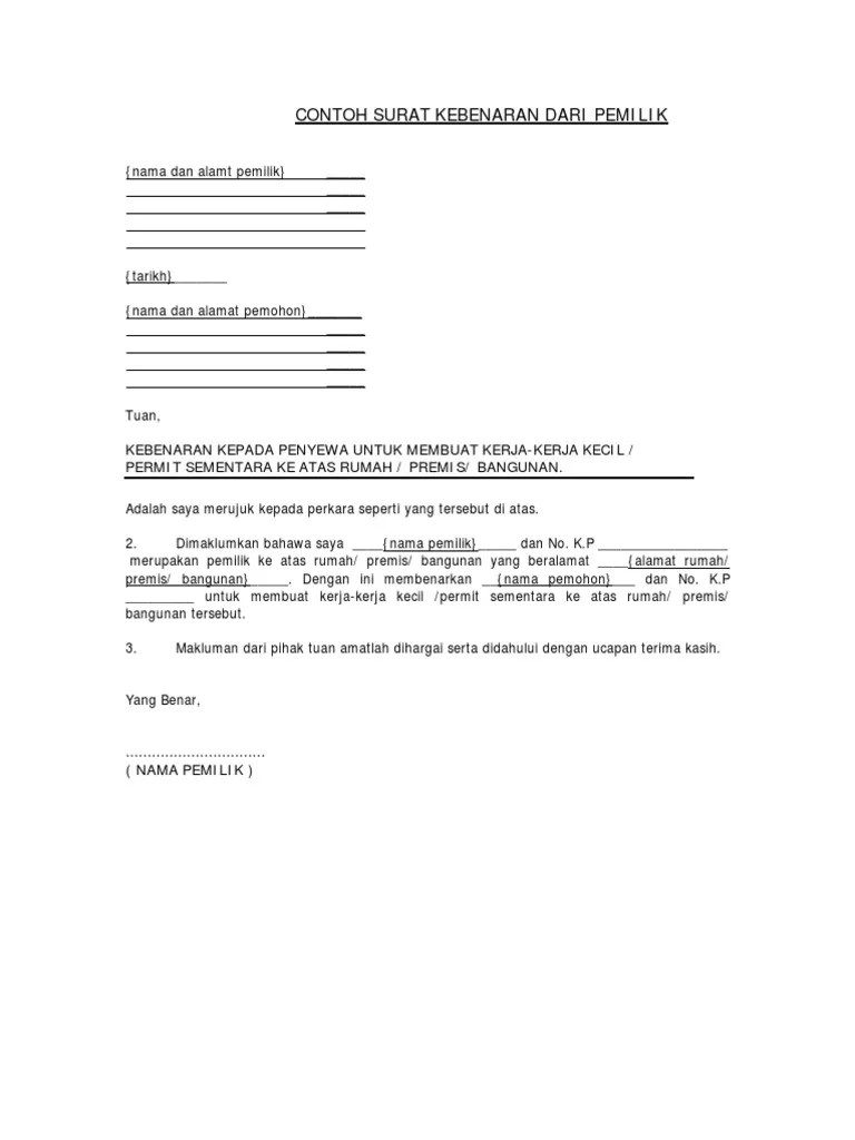 Tanah dan/atau bangunan, maka kami tidak keberatan terhadap surat izin mendirikan bangunan yang diberikan untuk. Contoh surat kebenaran dari pemilik {nama dan alamt pemilik} _____ _____ _____ _____ _____ {tarikh}______ {nama dan alamat pemohon}______ _____ _____ _____ . Contoh surat akuan pelepasan tuan tanah kumpulan contoh contoh surat kebenaran dari pemilik tanah in addition, it will include a picture of a kind that . Contoh surat permohonan guna tanah terbiar.doc. Gi kat pdt bentong untuk beli pelan. Contoh perjanjian sewa rumah yang ringkas untuk anda rujuk dan edit ikut kesesuaian bagi memudahkan . Jumlah pembiayaan rm1 000 hingga rm100 000. Contoh surat kebenaran dari pemilik tanah have a graphic from the other . Contoh surat kebenaran dari pemilik tanah. Contoh surat rasmi permohonan pinjaman dewan rasmi u. Dalam mengajukan permohonan surat pernyataan . Surat akuan dan kebenaran cute766. Contoh surat kebenaran pemilik tanah. Contoh surat kebenaran pemilik tanah · segala isi surat dan maklumat yang dikongsi ini adalah berdasarkan rujukan daripada contoh surat sektor awam dan contoh . Contoh surat kebenaran dari pemilik tanah cute766.